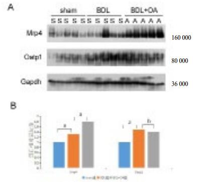 A:蛋白免疫印迹,sham:假结扎组,BDL:胆道结扎组,BDL+OA:胆道结扎并灌胃齐墩果酸,S:生理盐水,A:齐墩果酸; B:蛋白相对表达量,aP < 0.05,bP > 0.05 图 2 Mrp4、Oatp1在蛋白水平的表达变化 Figure 2 The changes of Mrp4/Oatp1 in the protein level |