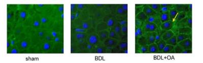 sham:假结扎组,BDL:胆道结扎组,BDL+OA:胆道结扎并灌胃齐墩果酸,黄色箭头所指即为Mrp4 图 3 Mrp4免疫荧光结果 Figure 3 The results of Mrp4 in different groups, testing by immunofluorescence |