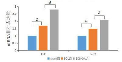 sham组:假结扎组,BDL组:胆道结扎组,BDL+OA组:胆道结扎并灌胃齐墩果酸aP < 0.05 图 4 AhR、Nrf2在mRNA水平的表达变化 Figure 4 The changes of Ahr/Nrf2 in the mRNA level |