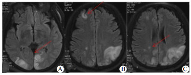 A、B、C为同一患者多层面的图像,患者,男性,50岁,多发伤致失血性休克,入院时昏迷状态,脉搏、血压测不到,紧急手术输血、输液,1 d后恢复意识,诉视物模糊,MRI示多发性脑梗死 图 1 患者头部MRI检查结果 |