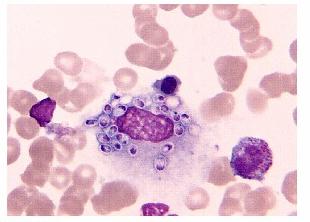 图 1 油镜下患者骨髓象见大量荚膜组织胞浆菌(瑞氏染色,×100) |