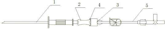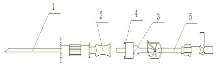 1:骨髓穿刺针;2:穿刺针手柄;3:出药口护帽;4:卡钩;5:三通连接管 图 2 一次性骨髓腔输液连接装置分解图 |