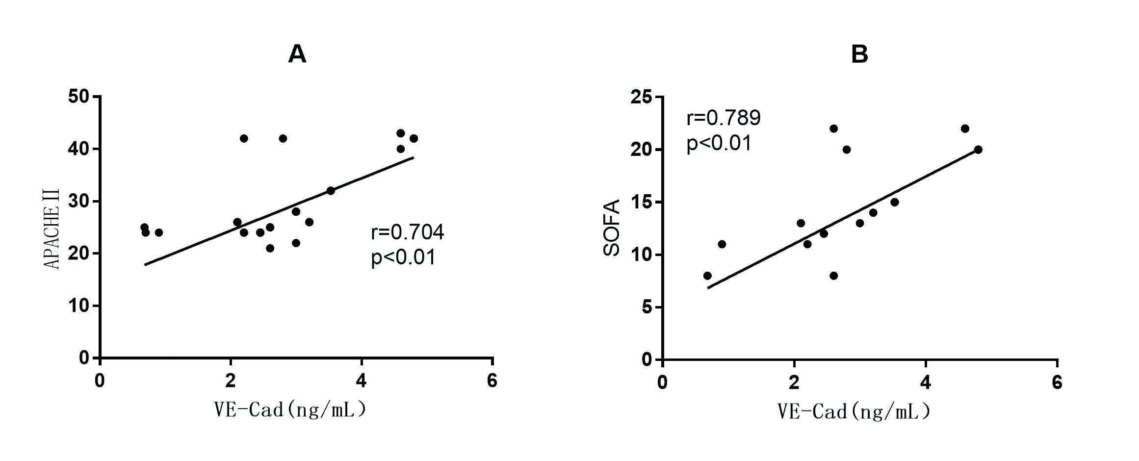 | 图 3 血清VE-Cad与APACHEⅡ评分和SOFA的相关性分析 Figure 3 The correlation between serum VE-cadherin and APACHEⅡand SOFA |