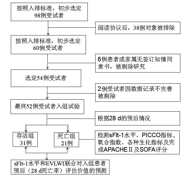 1.2 病例纳入和排除标准纳入标准:①年龄≥18岁,男女不限;②患病前均无免疫系统疾病;③同意参加试验者。排除标准:①孕期及哺乳期妇女;②过敏体质;③严重心、肝、肾功能不全者;④恶性肿瘤者;⑤严重精神障碍者;⑥不适合行PICCO检查的患者如房颤或心脏大量分流患者。本研究通过郑州大学附属郑州中心医院伦理委员会批准,所有入选患者均由本人或其家属签订知情同意书。