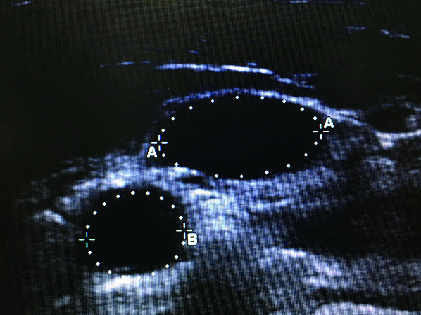 图 1 超声电子标记的颈内静脉(A)和颈总动脉(B)周长 Figure 1 The perimeter of the internal jugular vein (A) and common carotid artery (B) electronic marked by ultrasound