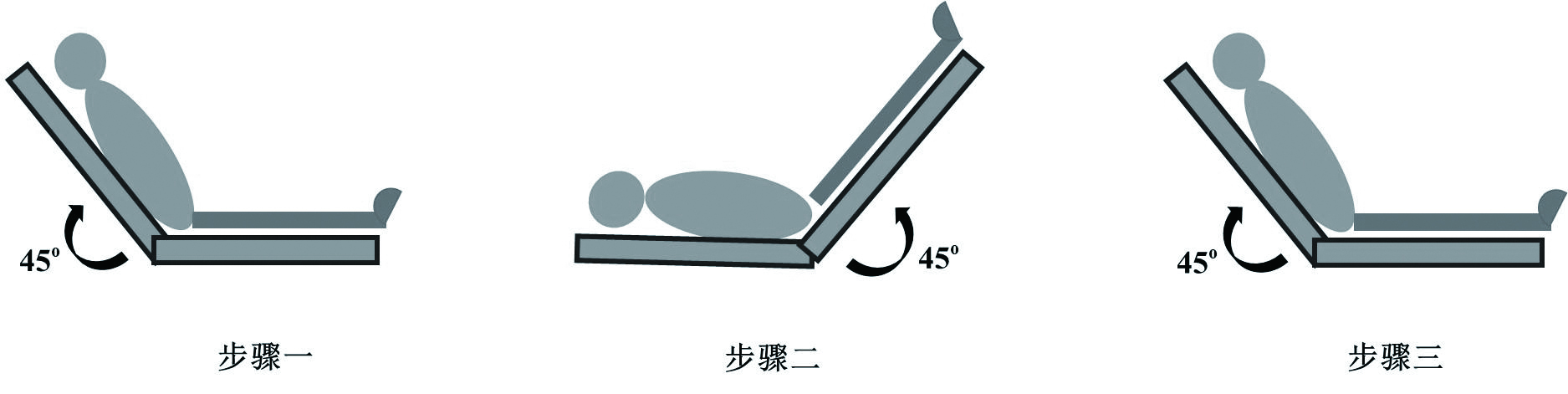 (1)半卧位抬高45°维持2 min,用超声测得CO指标,作为基线数值;(2)取仰卧位,下肢抬高45°维持1 min,用超声记录CO指标;(3)取步骤一体位,维持2 min,测量超声CO数值,评估CO指标是否回至基线数值[8]。见图 2