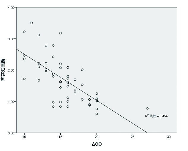 IJV平均直径为(14.01±4.82)mm,IJV直径与PLR试验引起的ΔCO值有较弱的相关性(r=-0.385,n=55,P=0.04)。IJV平均截面积为(100.33±61.89)mm2,IJV截面积与PLR试验引起的ΔCO值有清弱的相关性(r=-0.483,n=55,P < 0.01)。