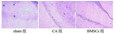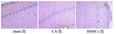 复苏后第1、3天,CA组、BMSCs组mNSS得分较假手术组均有明显升高(均P < 0.05); 在相同时间点,BMSCs组得分均低于CA组(均P < 0.05)。复苏后第7天,BMSCs组得分低于CA组(P < 0.05)。见表 1