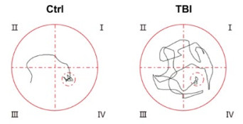 Ctrl组小鼠找到平台位置的时间为(11.2±2.1)s,TBI组小鼠寻找平台时间(54.6±8.4)s,与Ctrl组比较明显增加(t=-19.330,P < 0.05),提示脑爆震伤影响小鼠空间学习记忆能力(图 2)。