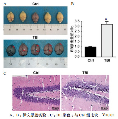 图 3 脑爆震伤对小鼠血脑屏障及病理改变的影响 Figure 3 Effects of traumatic brain injury on blood-brain barrier and pathological changes in mice