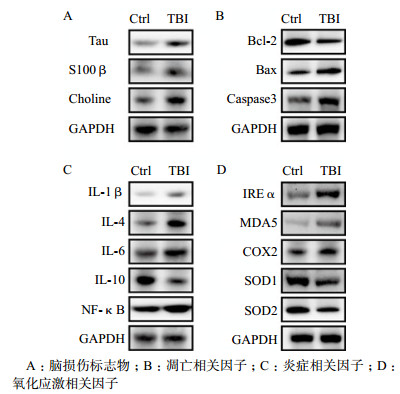 与Ctrl组脑组织损伤标志物Tau(0.26±0.03)、S100β(0.54±0.03)和胆碱(0.54±0.05)蛋白相比,TBI组Tau(0.46±0.04,t=-9.788,P < 0.05)、S100β(0.74±0.02, t=-12.433,P < 0.05)和胆碱(0.80±0.04,t=-7.970,P < 0.05)蛋白表达明显升高,提示脑爆震伤可导致小鼠脑组织损伤(图 4 A)。