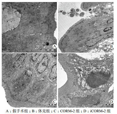 如图 2所示,透射电镜下可见假手术组肠黏膜上皮排列规则、紧密,上皮细胞表面微绒毛丰富,杯状细胞分泌旺盛,线粒体内质网结构正常,细胞间紧密连接紧密; 休克组肠黏膜上皮排列紧密,上皮表面微绒毛略稀疏,部分微绒毛倒伏,杯状细胞形态全无,呈空泡状,部分细胞线粒体肿胀,基质变淡,嵴变短,内质网缺失,上皮细胞紧密连接增宽。CORM-2组上皮细胞表面微绒毛较假手术组稀疏,较休克组上皮微绒毛倒伏减轻,线粒体、内质网结构保存较好。iCORM-2组肠上皮细胞微绒毛水肿,线粒体、内质网水肿、结构破坏明显。