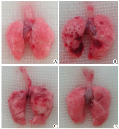A:对照组肉眼观肺脏粉嫩,无明显损伤;B:HO3d组肉眼观肺脏表面多处大片出血点,肺组织水肿;C:HO3d+Carba组肉眼观肺脏表面散在出血点,肺组织稍水肿;D:Carba组肉眼观肺脏无明显损伤 图 1 各组肺组织肉眼观察情况 Figure 1 Visual observation of lung tissue in each group