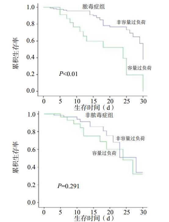 根据患者是否存在脓毒症将患者分为脓毒症组(n=154)和非脓毒症组(n=107)。脓毒症组容量过负荷(n=62)与非容量过负荷(n=92)患者30 d生存率差异有统计学意义(P < 0.01),非脓毒症组容量过负荷(n=31)与非容量过负荷(n=76)患者的30 d生存率差异无统计学意义(P=0.291),见图 3