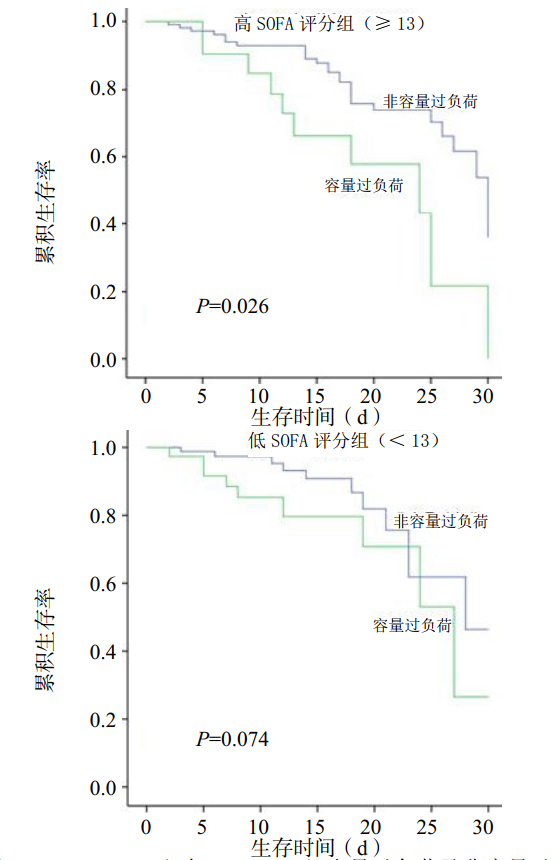根据患者SOFA评分将患者分为SOFA≥13组(n=135)与SOFA < 13组(n=126)。SOFA≥13组容量过负荷(n=57)与非容量过负荷(n=78)患者的30 d生存率差异有统计学意义(P=0.026),SOFA < 13组容量过负荷(n=35)与非容量过负荷(n=91)患者的30 d生存率差异无统计学意义(P=0.074),见图 4