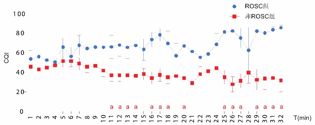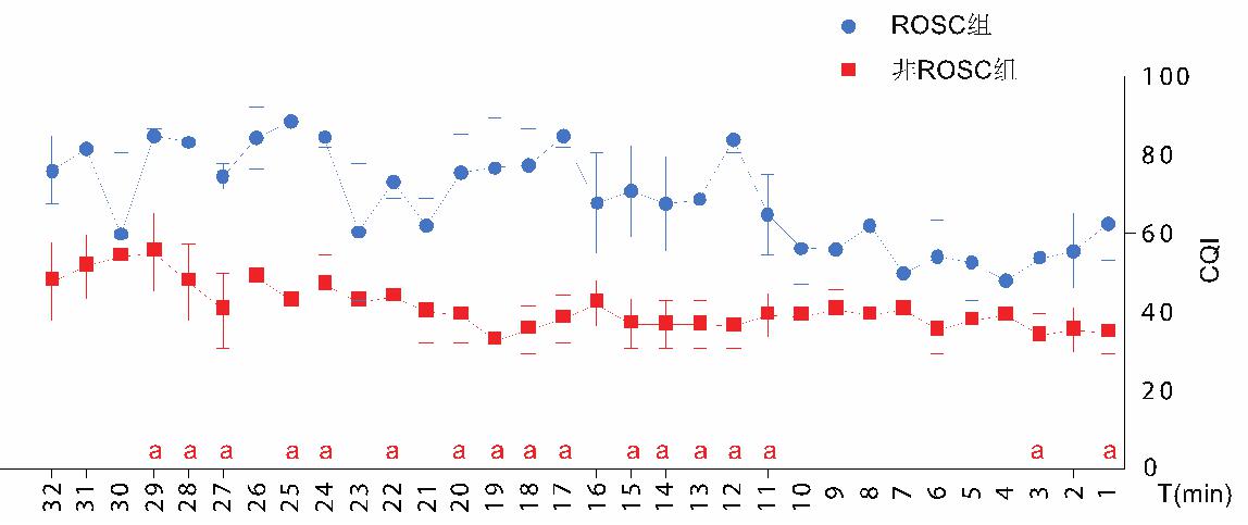 | 两组间参数差异有统计学意义,aP < 0.05 图 2 复苏停止前,ROSC组与非ROSC组间CQI不同时间点比较 Fig 2 CQI differences between ROSC group and non-ROSC group before CPR was stopped |