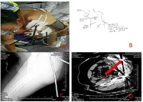1 资料与方法患者男,39岁,于2017年9月23日在建筑工地作业时不慎从7 m高处坠落,致全身被多根钢筋贯通伤,伤后即感全身疼痛,呼吸困难,神志清楚,经消防人员初步处理后由我院院前人员给予初级创伤救治,通知院内启动应急预案系统。入院后查体血压88/60 mmHg(1 mmHg=0.133 kPa),脉搏110次/min,R 20次/min,血氧饱和度95%,神清,面色及睑结膜苍白,强迫左侧卧位,可见1根钢筋(长约50 cm)自左肩胛区左前胸部,三根钢筋分别自左臀部至左肩部贯通,右臀部至上腹部贯通,左腰部贯通左上腹(图 1),伤口出血不止,呼吸活动左右不一致,左肺呼吸音减弱,右肺呼吸音清晰,四肢活动尚可,腹部压痛及反跳痛查体不配合。实验室检查WBC 12.66 ×109/L;其余化验结果均正常。腹部B超示:①右肝、胰腺显示不清;②脾周少量积液,深约1.2 cm,因伤者身上横着钢筋,无法以正常体位CT扫描,初步诊断为“胸腹部钢筋贯通伤;创伤性休克”。患者影像学资料见图 1。
