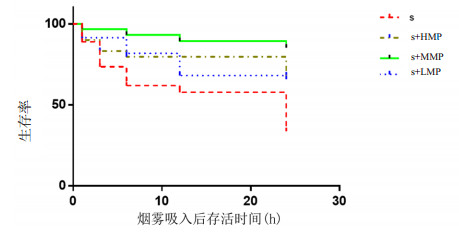 s:烟雾吸入组;s+HMP:烟雾+40 mg/kg甲泼尼龙组;s+MMP:烟雾+4 mg/kg甲泼尼龙组;s+LMP:烟雾+0.4 mg/kg甲泼尼龙组,均n=30 图 1 各组大鼠的生存曲线的比较 Fig 1 Survival proportions of different groups |