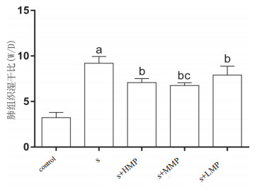 对各组大鼠的肺组织湿干比进行比较,如图 3所示,s组显著高于对照组(3.23±0.23,P < 0.01); s+HMP组为7.08±0.18,显著低于s组(P < 0.01);s+MMP组显著低于s组(P < 0.01),与s+HMP组差异无统计学意义(P=0.17);s+LMP组显著低于s组(P=0.028 1),与s+HMP组差异无统计学意义(P=0.062),与s+MMP组差异有统计学意义(P=0.020)。