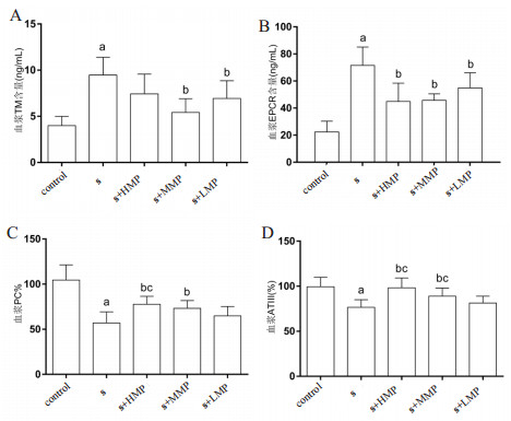 A:不同组血浆中TM的含量;B:不同组血浆中EPCR的含量;C:不同组血浆中PC的活性;D:不同组血浆中AT Ⅲ的活性。Control:对照组;s:烟雾吸入组;s+HMP:烟雾+40 mg/kg甲泼尼龙组;s+MMP:烟雾+4 mg/kg甲泼尼龙组;s+LMP:烟雾+0.4 mg/kg甲泼尼龙组;与对照组比较,aP < 0.05;与烟雾组比较,bP < 0.05;与s+LMP相比较,cP < 0.05。TM, 血栓调节蛋白; EPCR, 内皮细胞蛋白C受体; PC, 蛋白C; AT Ⅲ, 抗凝血酶Ⅲ 图 8 甲泼尼龙对各组血浆中抗凝的影响 Fig 8 Comparison of the anti-coagulation factors in plasma among the 5 groups |