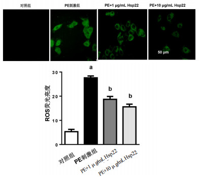 与PE刺激组比较,1和10μg/mL的Hsp22降低ROS的水平(18.7±1.8和15.6±1.1,t=15.23,P < 0.05;t=21.80,P < 0.05),见图 4。