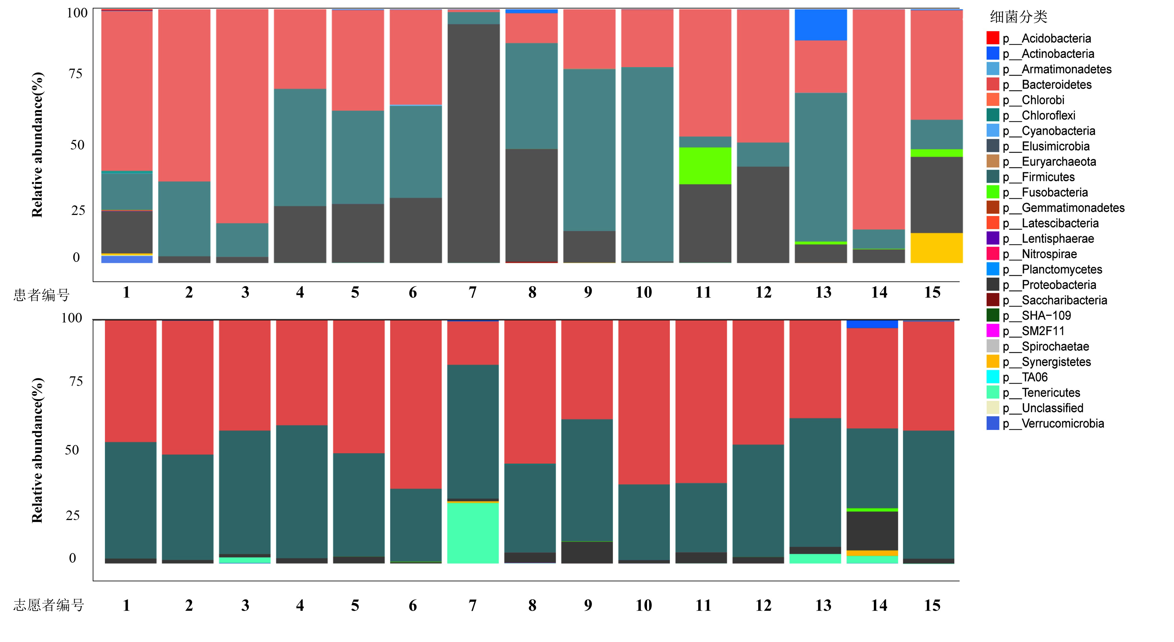 每个色柱代表 1名志愿者或患者,Relative abundance:相对丰富度。菌群中英文对照名如下:p__Acidobacteria酸杆菌门,p__Actinobacteria放线菌门,p__Armatimonadetes装甲菌门,p__Bacteroidetes拟杆菌门,p__Chlorobi绿菌门,p__Chloroflexi绿弯菌门,p__Cyanobacteria蓝细菌门,p__Elusimicrobia迷踪菌门,p__Euryarchaeota广古菌门,p__Firmicutes厚壁菌门,p__Fusobacteria梭杆菌门,p__Gemmatimonadetes芽单胞菌门,p__Latescibacteria黏胶球形菌门,p__Lentisphaerae黏胶球形菌门,p__Nitrospirae硝化螺旋菌门,p__Planctomycetes浮霉菌门,p__Proteobacteria变形菌门,p__SHA-109尚无正式译名,p__SM2F11尚无正式译名,p__Saccharibacteria酸杆菌门,p__Spirochaetae螺旋体门,p__Synergistetes互养菌门,p__TA06,p__Tenericutes柔壁菌门,p__Verrucomicrobia疣微菌门,p__Unclassified无法分类 图 1 脓毒性休克患者及志愿者肠道菌群门层次分布图 Fig 1 The composition of bacterial microbial at the phylum level in septic shock patients and healthy subjects |