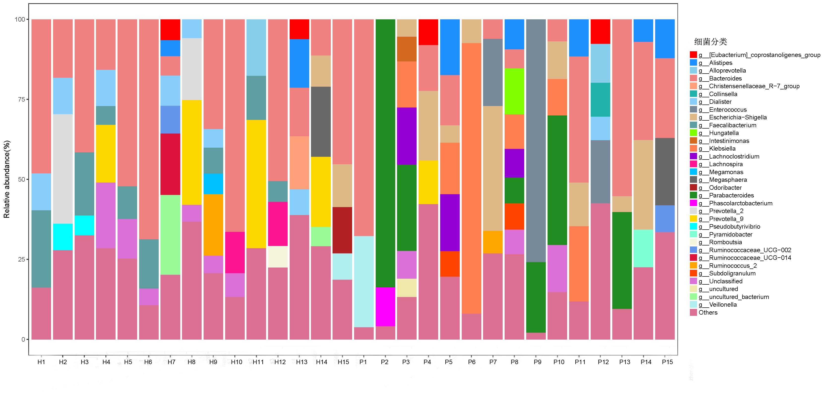 每个色柱代表 1名志愿者或患者,Relative abundance:相对丰富度,“H”代表志愿者,“P”代表患者,菌群中英文对照名如下: g_[Eubacterium]_coprostanoligenes_group产粪甾醇真细菌,g_Alistipes另枝菌属,g_Alloprevotella普雷沃菌属,g_Bacteroides脆弱拟杆菌属,g_Christensenellaceae_R-7_group克里斯滕森菌属,g_Collinsella柯林斯菌属,g_Dialister小类杆菌属,g_Enterococcus肠球菌属,g_Escherichia-Shigella大肠杆菌志贺菌属,g_Faecalibacterium普氏粪杆菌属,g_Hungatella甲烷细菌属,g_Intestinimonas肠单胞菌属,g_Klebsiella克雷白杆菌属,g_Lachnoclostridium毛螺梭菌属,g_Lachnospira毛螺旋菌属,g_Megamonas巨单胞菌属,g_Megasphaera巨球型菌属,g_Odoribacter紫单胞杆菌属,g_Parabacteroides副杆菌属,g_Phascolarctobacterium考拉杆菌属,g_Prevotella_2二路普菌属,g_Prevotella_9九路普菌属,g_Pseudobutyrivibrio假丁酸弧菌属,g_Pyramidobacter锥形杆菌属,g_Romboutsia尚无正式译名,g_Ruminococcaceae_UCG-002瘤胃菌科琥珀酸弧菌属002,g_Ruminococcaceae_UCG-014瘤胃菌科琥珀酸弧菌属014,g_Ruminococcus_2瘤胃菌科属,g_Subdoligranulum罕见小球菌属,g_Unclassified无法分类,g_Uncultured无法培养,g_Uncultured_bacterium无法培养细菌,g_Veillonella韦荣球菌属 图 2 脓毒性休克患者及志愿者肠道菌群属层次分布图 Fig 2 The composition of bacterial microbial at the genus level in septic shock patients and healthy subjects |