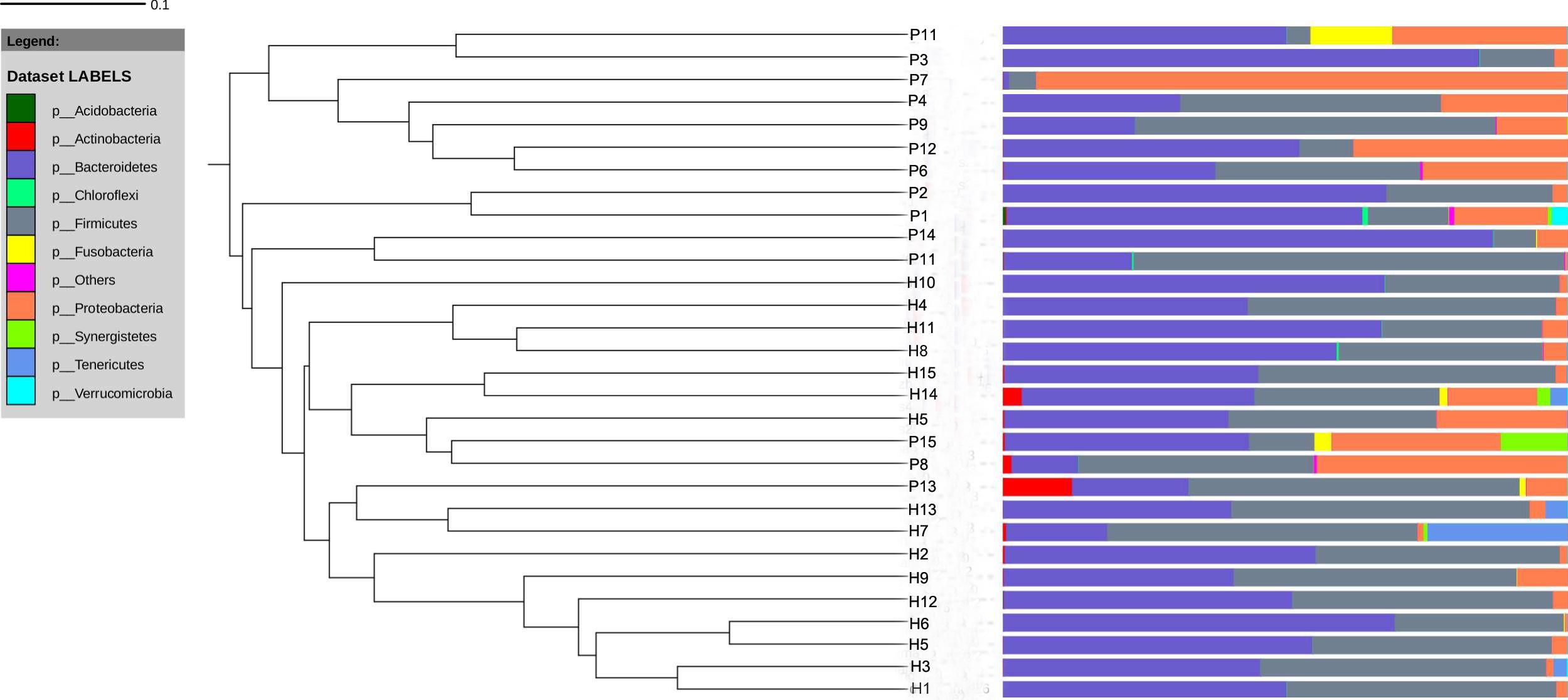 “H”代表志愿者,“P”代表患者。菌群中英文对照名如下:p__Acidobacteria酸杆菌门,p__Actinobacteria放线菌门,p__Bacteroidetes拟杆菌门,p__Chloroflexi绿弯菌门,p__Firmicutes厚壁菌门,p__Fusobacteria梭杆菌门,p__Proteobacteria变形菌门,p__Synergistetes互养菌门,p__Tenericutes柔壁菌门,p__Verrucomicrobia疣微菌门,p__Others其他菌群 图 3 肠道菌群分类相似性树 Fig 3 Similarity tree of intestinal microbiota classification |