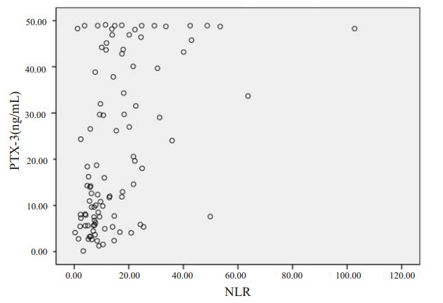 图 1及图 2分别表明了不同研究指标所绘制的受试者工作特征曲线图。图 1为不同指标所绘制的ROC曲线间。综合上述4项单一指标间的比较可以看出PTX-3对脓毒症患者预后的评估有着良好的优势。PTX-3与传统的APACHE Ⅱ评分存在着一定的可比性。间接说明PTX-3在预测脓毒症患者病情的严重程度上有一定的可靠性。图 3为PTX-3与NLR的相关性分析,其Pearson相关系数r=0.455(中度相关),P < 0.01,说明PTX-3血浆浓度和NLR存在着一定的相关性。