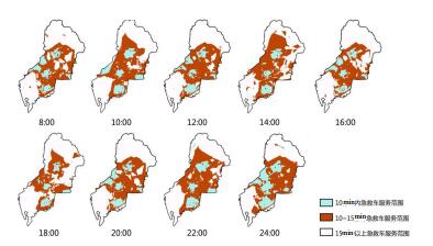 2.3 南山区院前急救资源时空分布特征运用服务区分析法计算得到全市院前急救资源的空间分布特征,其中南山区院前急救资源在10 min内能够覆盖服务全区56.57%的人口,15 min内能够覆盖76.98%的人口,结果显示尽管南山区是深圳市一大重要的城市组团,但是院前急救资源却十分贫乏。选择南山区作为进一步研究的对象,运用动态数据最优路径算法计算南山区一天内不同时间段的院前急救资源10 min和15 min内能够覆盖的范围,选定一个工作日8:00-24:00每隔2 h进行一次计算,得到南山区院前急救资源在一天范围内的服务覆盖变化(图 3),将其与南山区的人口数据进行叠加分析。