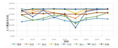 从南山区一天内各个街道服务人口百分比变化来看(图 5~6),覆盖人口百分比变化最剧烈的时段正好是城市晚高峰,无论是10 min还是15 min服务覆盖范围内,沙河街道的变化幅度都最大,说明沙河街道院前急救资源的覆盖人口受交通路况的影响十分大。院前急救资源10 min服务覆盖范围内,南山街道和粤海街道的变化幅度也较大;15 min服务覆盖范围内,南山街道和桃园街道的变化幅度较大。蛇口街道、招商街道则受交通路况的影响较小。