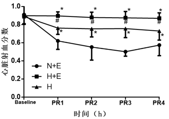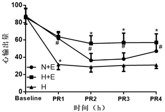 注:与N+E组比较,a P < 0.05;与H组比较,bP < 0.05;与基础状态比较,cP < 0.05 |