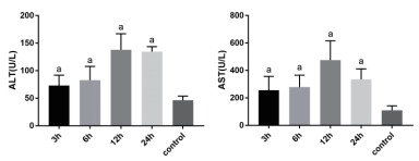 各时间点组与对照组相比较,aP<0.05 图 1 CLP术后不同时间点小鼠ALT和AST的变化 Fig 1 The variation of ALT and AST after CLP between different mice groups |