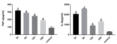 CLP术后时TNF-α于3 h达到最高,随时间延长呈逐渐下降趋势。3 h组(320.21±8.9)pg/ml与对照组(89.86±12.17)pg/ml相比较,t=26.47,P < 0.05。IL-6在6 h到达高峰随后下降,在12 h后又反升, 对不同时间点组小鼠进行方差分析,F=435,P < 0.01。6 h组(2 589.63±27.96)pg/ml与对照组(307.25±12.45)pg/ml相比较,t=129.2 P < 0.05,见图 2。