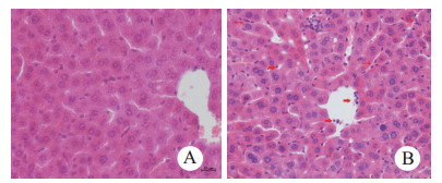 A:对照组, B:CLP 6h组 图 3 小鼠肝组织病理学改变(HE, ×400) Fig 3 Pathological changes in mouse liver tissue |