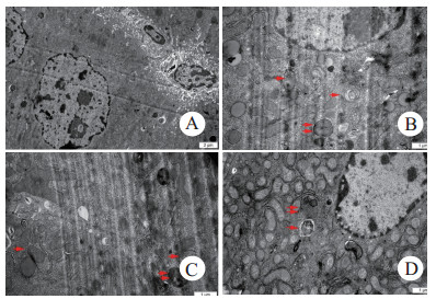 A为对照组(×8 000),B、C、D均为CLP 6 h组(×12 000) 图 4 小鼠肝组织自噬体和自噬溶酶体 Fig 4 The autophagosome and autolysosome in mouse liver tissue |