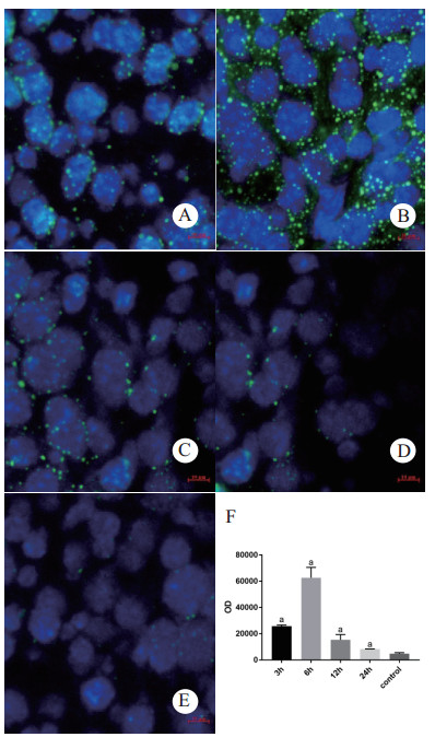 A:3 h组B:6 h组C:12 h组D:24 h组E:control组F:各组蛋白荧光强度各时间点组与对照组相比较,aP<0.05 图 6 小鼠肝组织LC3Ⅱ蛋白荧光强度变化(×400) Fig 6 Fluorescence intensity changes of LC3Ⅱ protein in mouse liver tissue(×400) |