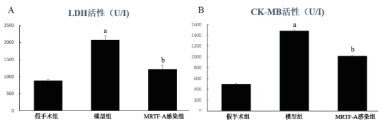 A:LDH活性检测。B:CK-MB活性检测。对假手术组比较,aP < 0.05;与模型组比较,bP < 0.05 图 1 生化检测评价血清心肌酶活性 Fig 1 Biochemical analysis was used to detect serum myocardial enzyme activity |