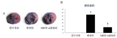 1.3 动物模型构建模型组和MRTF-A感染组,用腹腔注射水合氯醛(0.3 ml/100 g)麻醉动物,固定于手术台上。大鼠气管插管,利用小动物呼吸机以60次呼吸/ min,吸气/呼气比2 : 1,潮气量18 ml/kg进行辅助通气。心脏暴露在左胸第四和第五肋骨之间。在心脏暴露之后,左前降支冠状动脉(LAD)采用丝缝线结扎,可逆转阻断LAD。使心肌缺血30 min,再灌注120 min。缺血-再灌注后,处死大鼠,采集心肌组织,进行下一步的研究。假手术组仅暴露心脏,不做心肌缺血-再灌注处理。