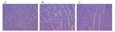 A:假手术组,B:模型组,C:MRTF-A感染组 图 3 HE染色测定心肌损伤程度(×20) Fig 3 Degree of myocardial injury was measured by HE staining(×20) |