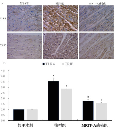 免疫组织化学(图 4A)和qPCR(图 4B)分析显示。与假手术组相比,心肌缺血30 min再灌注2 h后TRL4、TRIF的蛋白和mRNA表达明显上调(P < 0.05)。MRTF-A感染组降低了TRL4、TRIF的蛋白和mRNA表达(P < 0.05)。