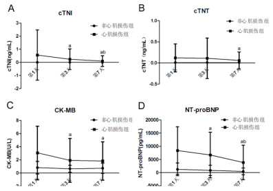 与非心肌损伤组相比,心肌损伤组cTNT[(0.01±0.023) ng/mL vs (0.10±0.025) ng/mL, F=10.300, P=0.002)、cTNI[(0.005±0.07) ng/mL vs (0.30±0.08) ng/mL, F=7.708, P=0.006]、CK-MB[(0.745±0.251)U/L vs (2.286±0.265) U/L, F=68.781, P < 0.01]、NT-ProBNP[(851.370±799.831) pg/mL vs (6 318±840.874) pg/mL, F=38.161, P=0.000]明显升高,并随时间逐渐减低(图 1)。