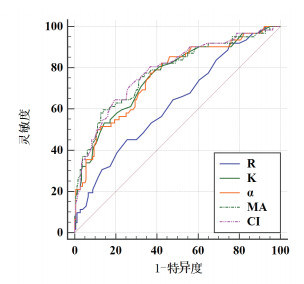 TEG,血栓弹力图;TIC,创伤性凝血病;ROC曲线,受试者工作特征曲线;AUC,曲线下面积。AUC:R=0.629,P=0.002;K=0.763,P<0.01;α=0.758,P<0.01;MA=0.779,P<0.01;CI=0.786,P<0.01 图 1 TEG各参数诊断TIC的ROC曲线 Fig 1 ROC curve of TEG parameters and TIC |