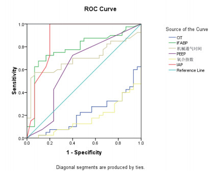 ROC曲线结果显示:危险因素IAP、IFABP、机械通气时间及PEEP的曲线下面积均大于0.5,对机械通气患者并发AGI有一定的预测诊断价值;而危险因素CIT和氧合指数的曲线下面积均小于0.5,对机械通气患者并发AGI没有预测诊断价值。其中,IAP的敏感性、特异性分别为95.0%、80.0%,IFABP的敏感性、特异性分别为87.5%、50.0%,机械通气时间和PEEP的特异性及敏感性相对较低,提示这两项指标对机械通气患者并发AGI的预测诊断价值较小。见表 3, 图 1。