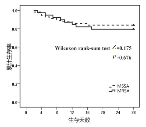 两组患者的APACHE Ⅱ评分比较差异无统计学意义(P﹥0.05),但MRSA组患者的SOFA评分显著高于MSSA组(P < 0.05)。两组住院天数超过30 d患者例数和28 d内死亡患者例数比较差异无统计学意义(P > 0.05,表 3)。以28 d为期限进行生存分析,结果两组患者比较差异无统计学意义(P > 0.05,图 1)。