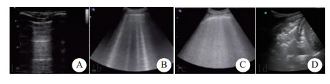 A:图片表现为A线,记0分;B:图片表现为散在的B线,图中可见4条B线,每条B线计1分,共4分;C:图片表现弥漫性B线,最多可见7条B线,共计7分;D:图片出现实变征,共计5分 图 1 超声B线计分及常见超声图像模式 |