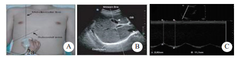A:膈肌检查部位于双侧锁骨中线肋弓下;B:获取的右侧膈肌超声图片(A、B图片来源:Ferrari G, De Filippi G, Elia F, Apra F, et al.Diaphragm ultrasound as a new index of discontinuation frommechanical ventilation. Crit Ultrasound J.2014 Jun 7;6(1):8)。C:表示M超模式下膈肌在吸气相与呼气相的运动幅度,虚线A代表呼气相膈肌距离探头的距离,虚线B代表吸气相膈肌距离探头的距离,线B的长度减去线A的即为膈肌移动度,即DD 图 2 膈肌超声检查及数据收集方法 |