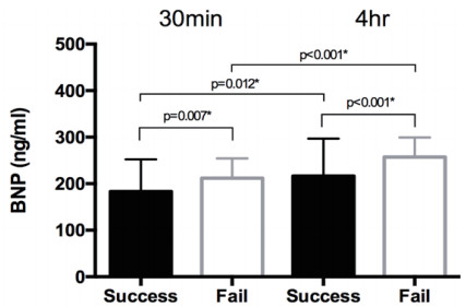 SBT30 min BNP(ng/ml) | 182.9±98.4 | 222.9±43.0 | 2.036 | 0.035a |