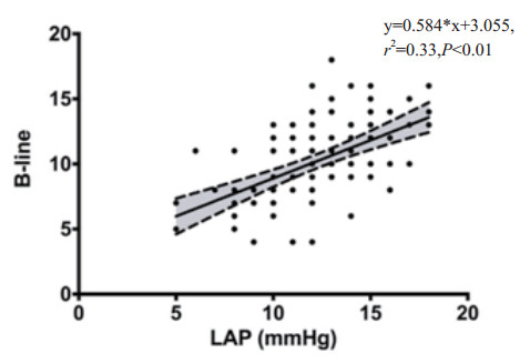 两组研究对象LUBS与LAP呈正相关,随着LAP升高,肺部B线逐渐增多,提示心功能越差,撤机的成功率越低, 见图 4。