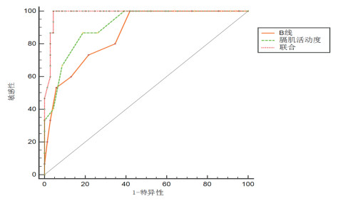 根据传统SBT预测撤机成功率约为74.92%[12],单独应用肺部超声LUBS、膈肌移动度的指标对预测撤机成功与否亦有一定价值,但单一指标的敏感度、特异度、阳性预测值均不高;在某些特殊患者的撤机过程中存在一定局限性。比如膈肌麻痹患者,当肺部炎症控制、心功能改善的情况下,由于膈肌活动障碍,无法提供足够的潮气量,因此单一的LUBS评估并不能可靠的预测撤机的成功率。本研究将LUBS与DD同时纳入撤机前的评估,个体化的反应了患者的心肺功能、膈肌功能的状态。对145例机械通气24 h以上的危重患者进行研究,通过绘制ROC曲线显示,联合评价的AUC面积为0.985,优于LUBS(AUC=0.862)、DD(AUC=0.91),P=0.019;LUBS的截断值为<9分,DD的截断值为>17 mm,撤机成功敏感度100%,特异度95.6%,阳性预测值为0.833,阴性预测值为1.0,提示联合评价对预测撤机过程成功率具有更高的准确性。